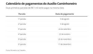 O auxílio vai começar ser pago em 16 de agosto, quando serão pagas duas parcelas (referentes a julho e agosto). Estão previstos os pagamentos de seis parcelas de R$ 1 mil até dezembro.