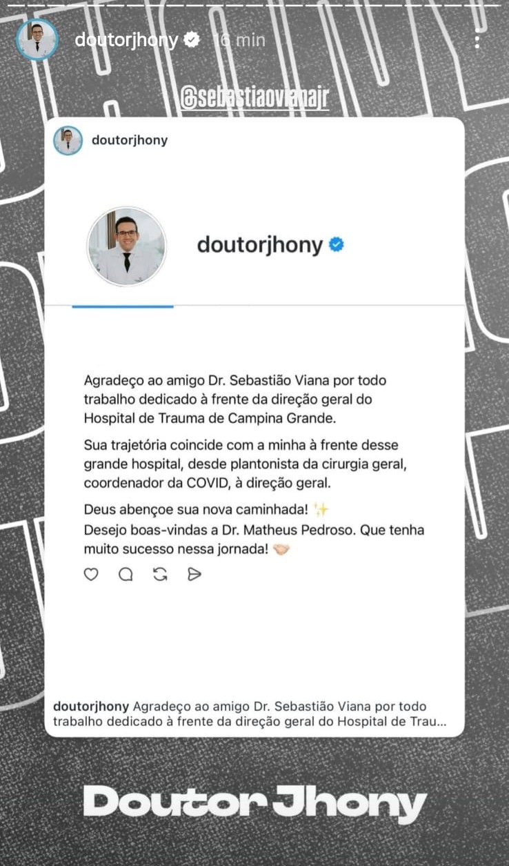 A exoneração do médico Sebastião Viana da direção do Hospital de Trauma de Campina Grande continua repercutindo nos bastidores da saúde estadual. Nesta quarta-feira (19), o presidente da PB Saúde, Jhony Bezerra, fez uma postagem sobre a decisão do governador João Azevêdo de substituir Sebastião pelo médico Matheus Pedroso, genro do presidente da Assembleia Legislativa, deputado Adriano Galdino.